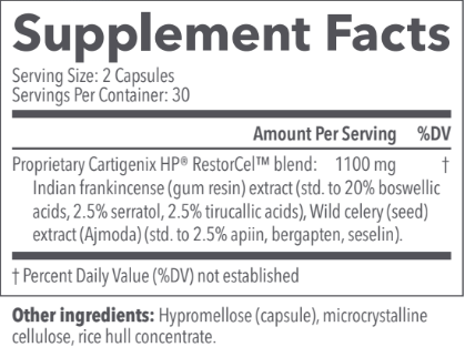Cartigenix HP contains a proprietary clinically studied blend of 13 bioactive constituents; including serratol from Boswellia serrata and compounds derived from a unique celery seed from Northern India. This patent-pending extract preserves a complex of complementary compounds that work synergistically.*