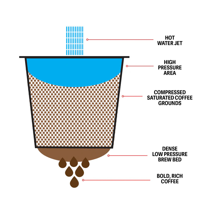 Danger Compostable Pods work with your single serve machine's high pressure water jets to unlock the coffee’s full potential. The water saturates the grounds evenly and compresses them into a dense, low pressure brew bed. The outcome is bold, rich flavors and a perfectly balanced, clean cup every time.