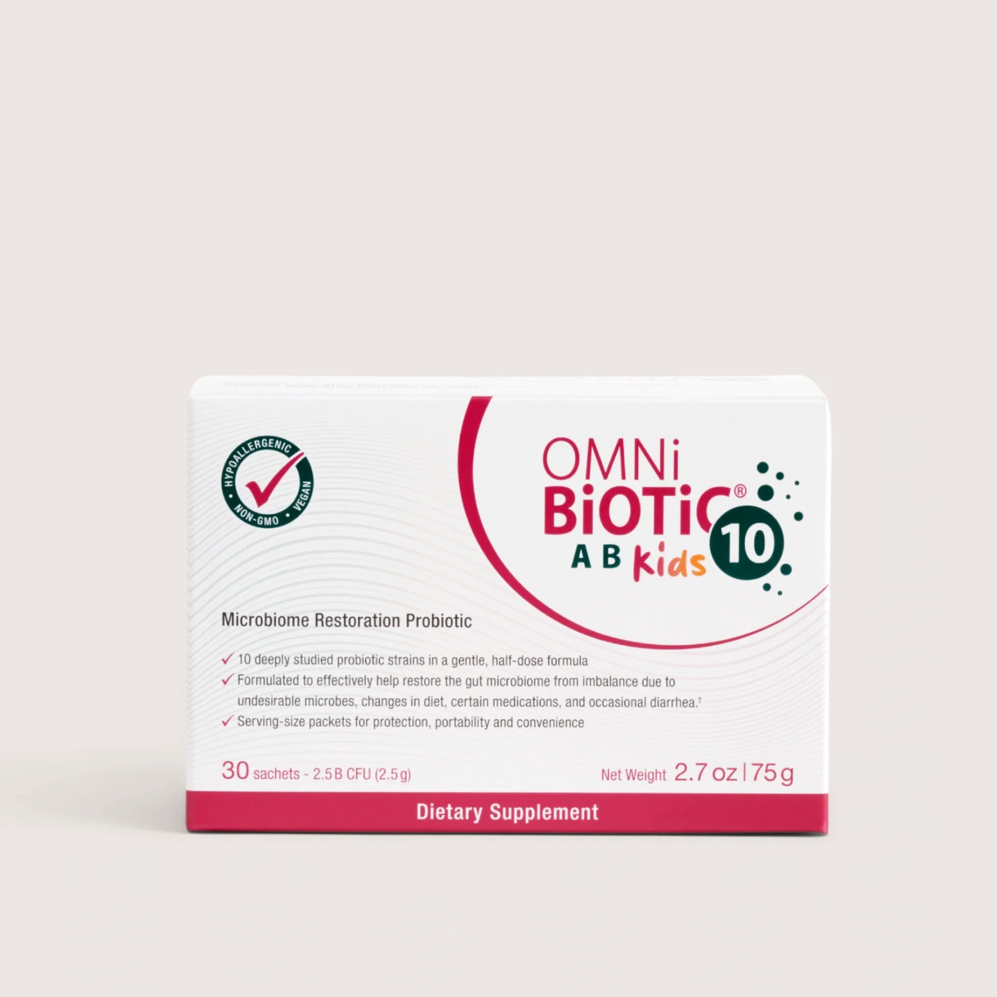 From antibiotics to everyday environmental exposures, many factors can disrupt a child’s delicate gut microbiome—making room for harmful bacteria or yeasts to take hold. This imbalance can lead to tummy troubles, weakened immunity, or even recurrent infections. Omni-Biotic AB 10 Kids is a clinically-backed, multi-strain probiotic designed to gently restore and maintain your child’s gut flora balance and diversity, and with that support healthy digestion and gut function, especially during and after antibiotic intake. Omni-Biotic AB 10 Kids can also be taken on a daily basis for ongoing GI support, to help keep your child’s digestion and immunity strong.