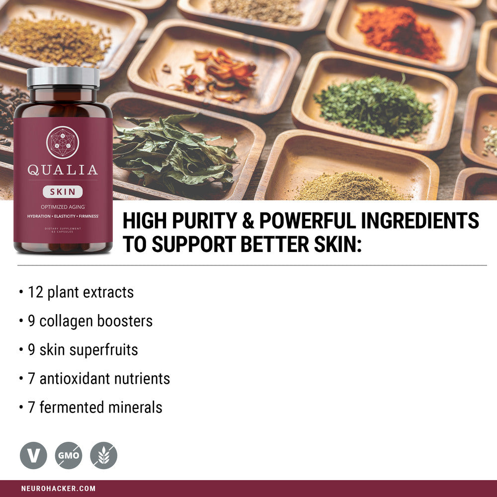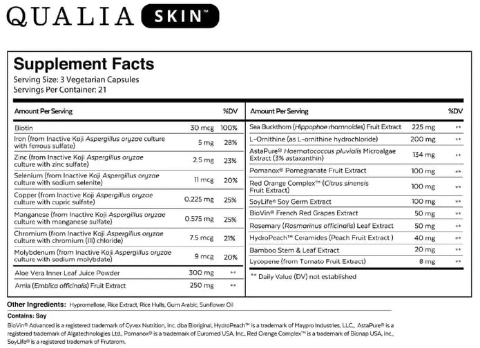 Formulated after extensively researching skin health and aging mechanisms, and after evaluating scientific research on more than 80 ingredients, Qualia Skin is the culmination of Qualia's complex systems approach to ingestible nutraceuticals. The result is Qualia Skin—a unique formula that places a special emphasis on plant-based ingredients to help feed and nourish the skin. Qualia Skin supplies 21 skin-nourishing ingredients that collectively work to transform skin from within to hydrate, firm, brighten, and smooth skin.*
